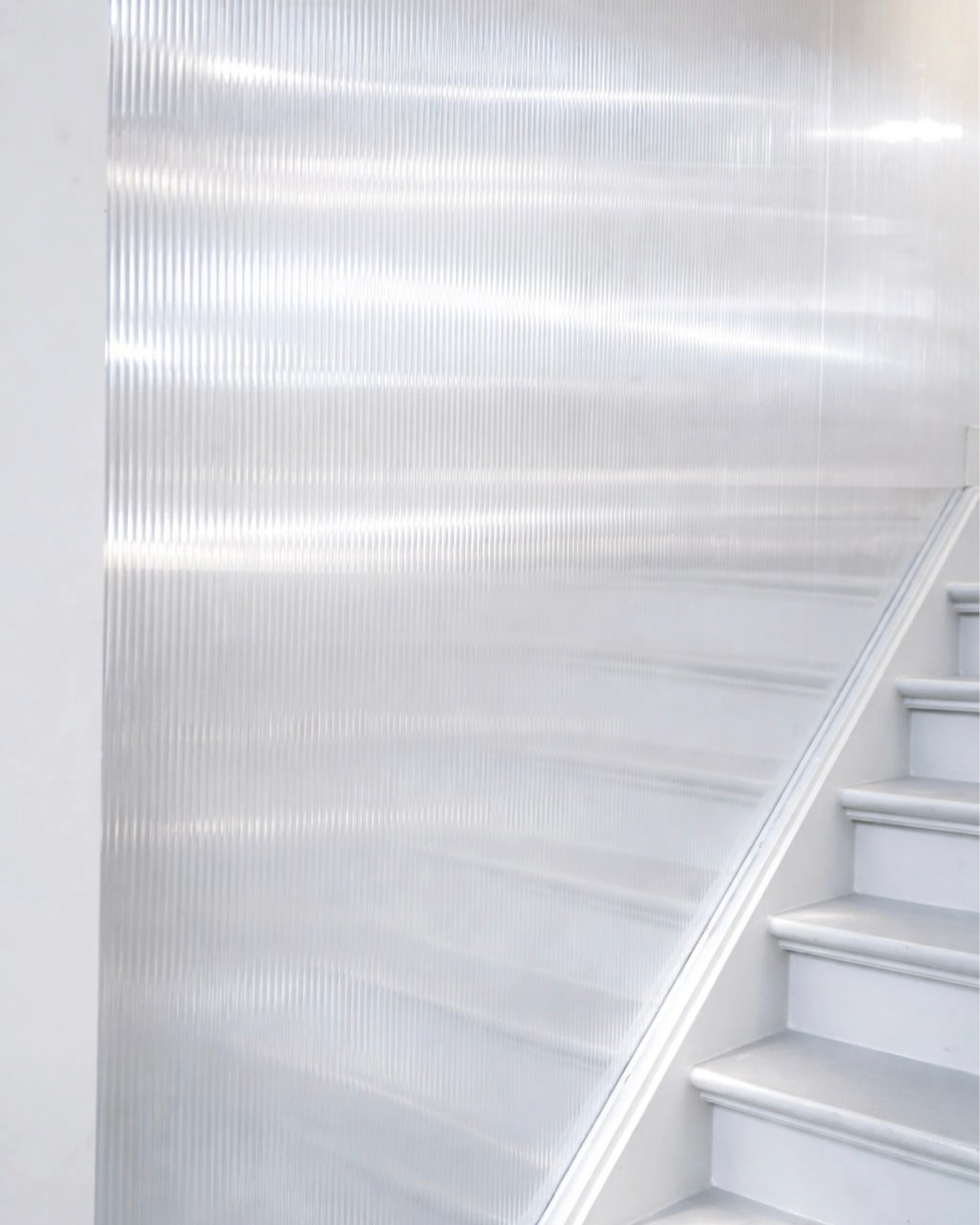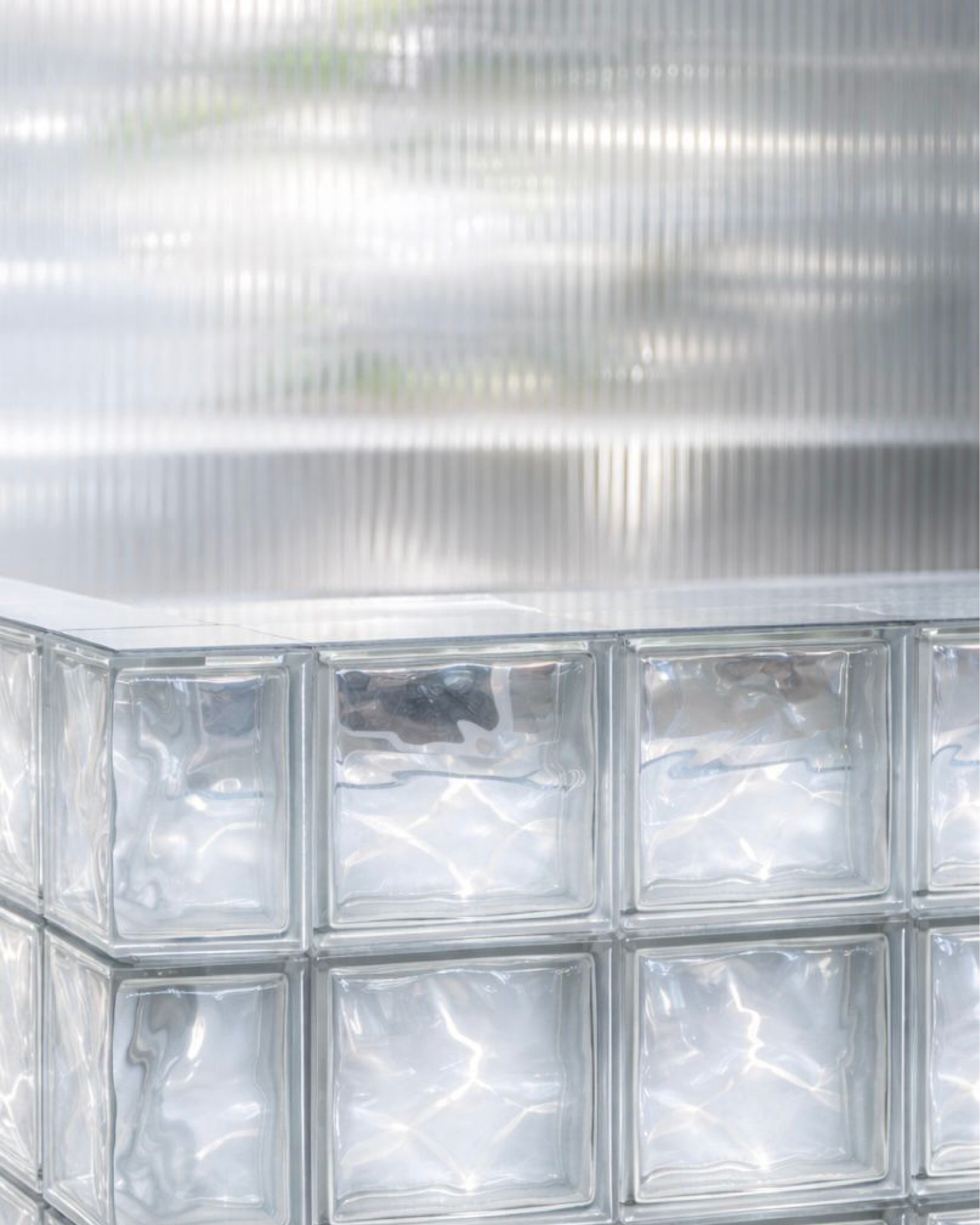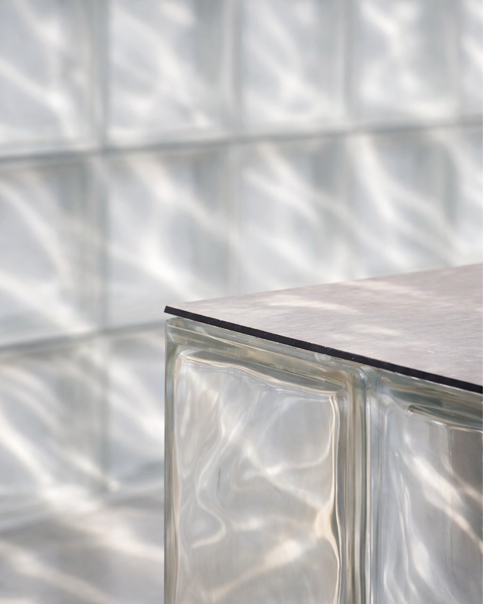 Materialen als glasblokken en ribbelglas vangen en breken het licht, waardoor een gelaagde, bijna vloeibare ruimte ontstaat.