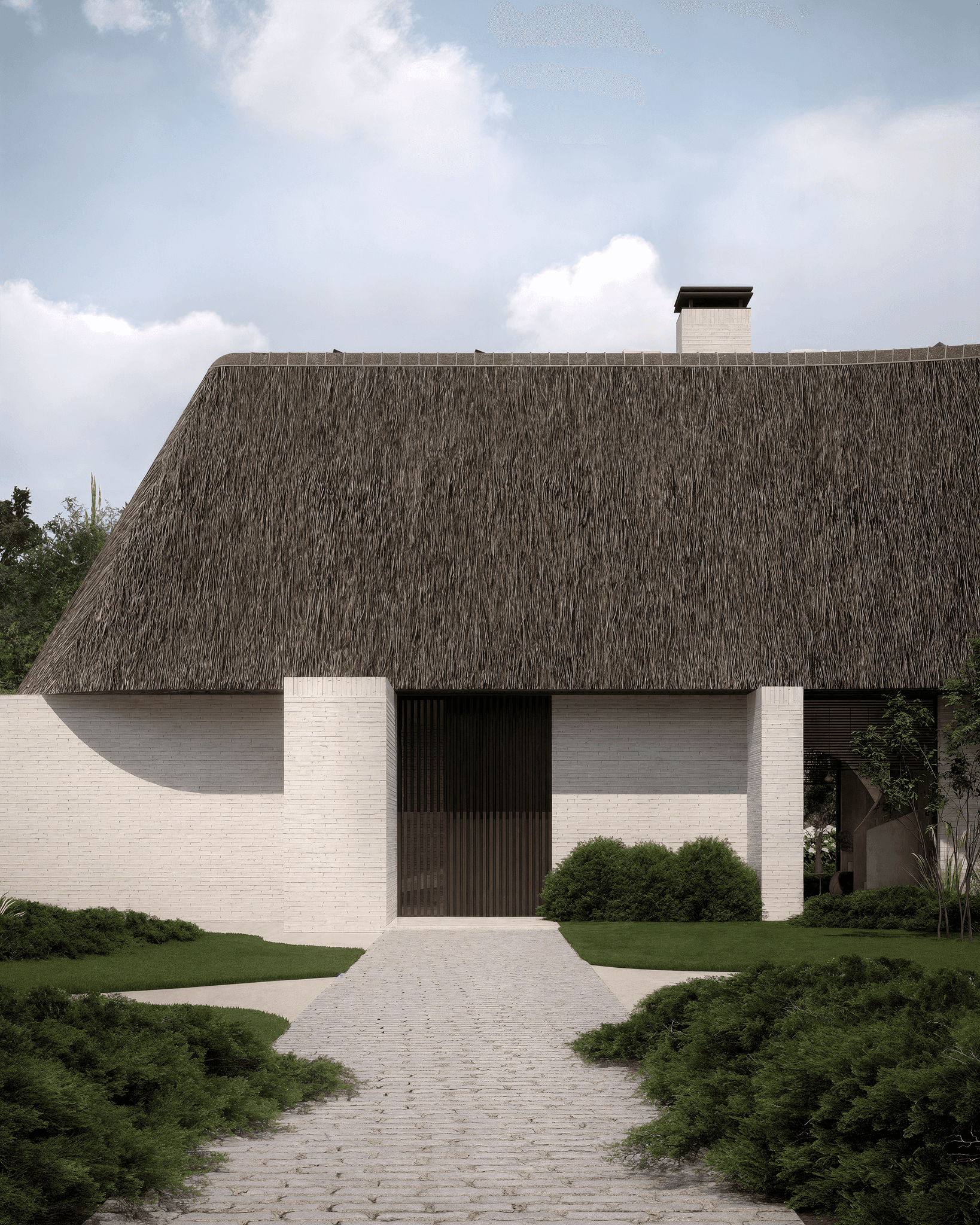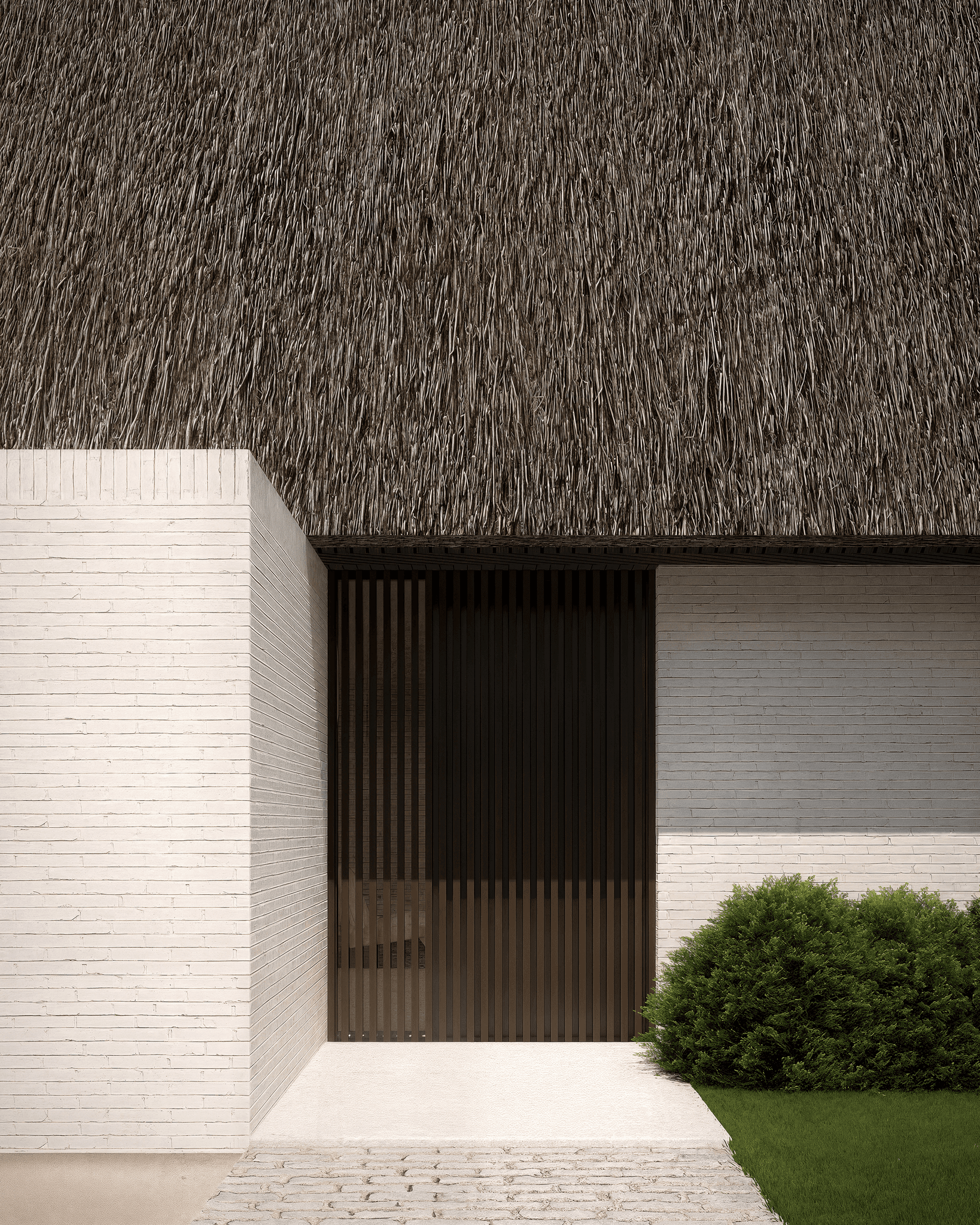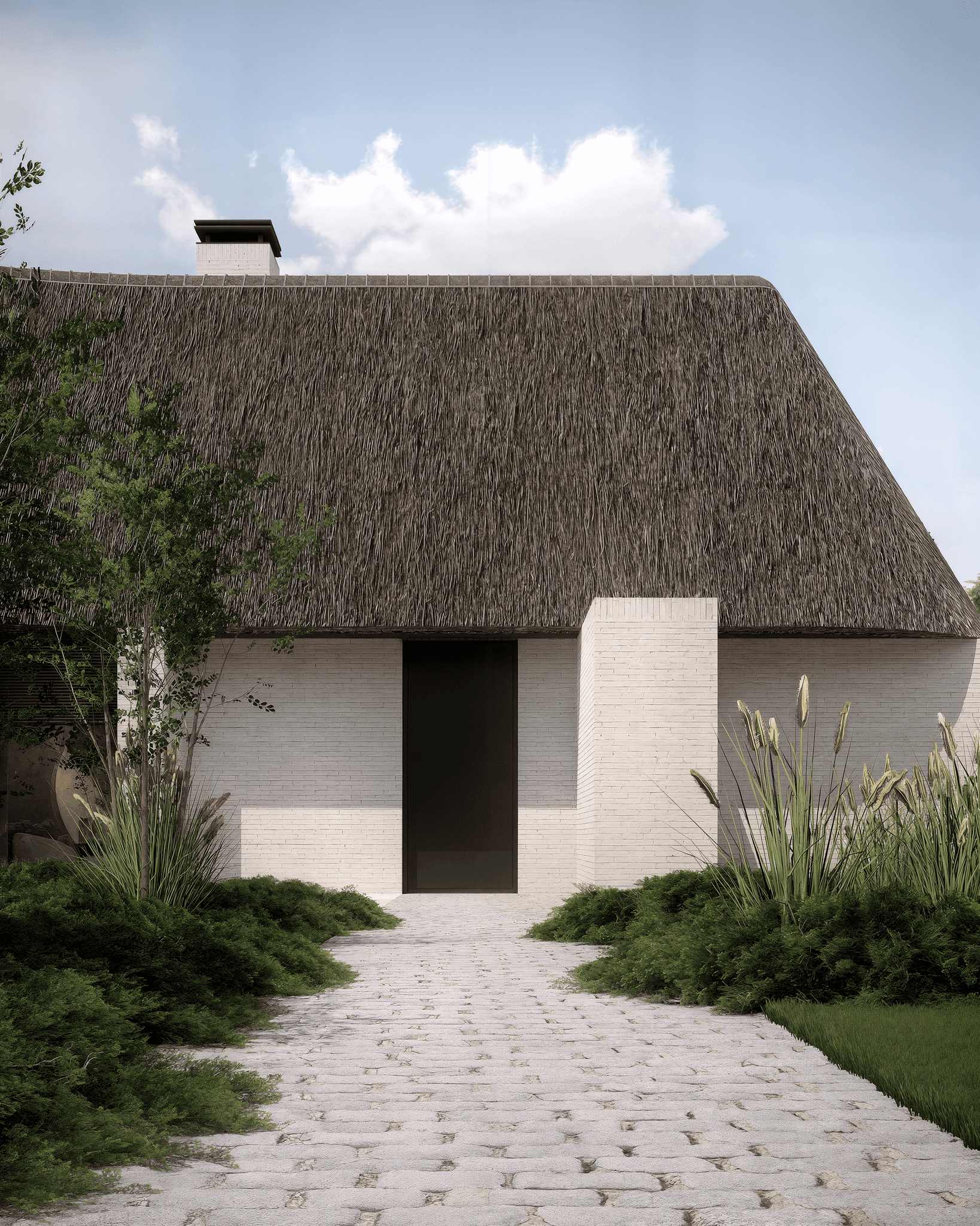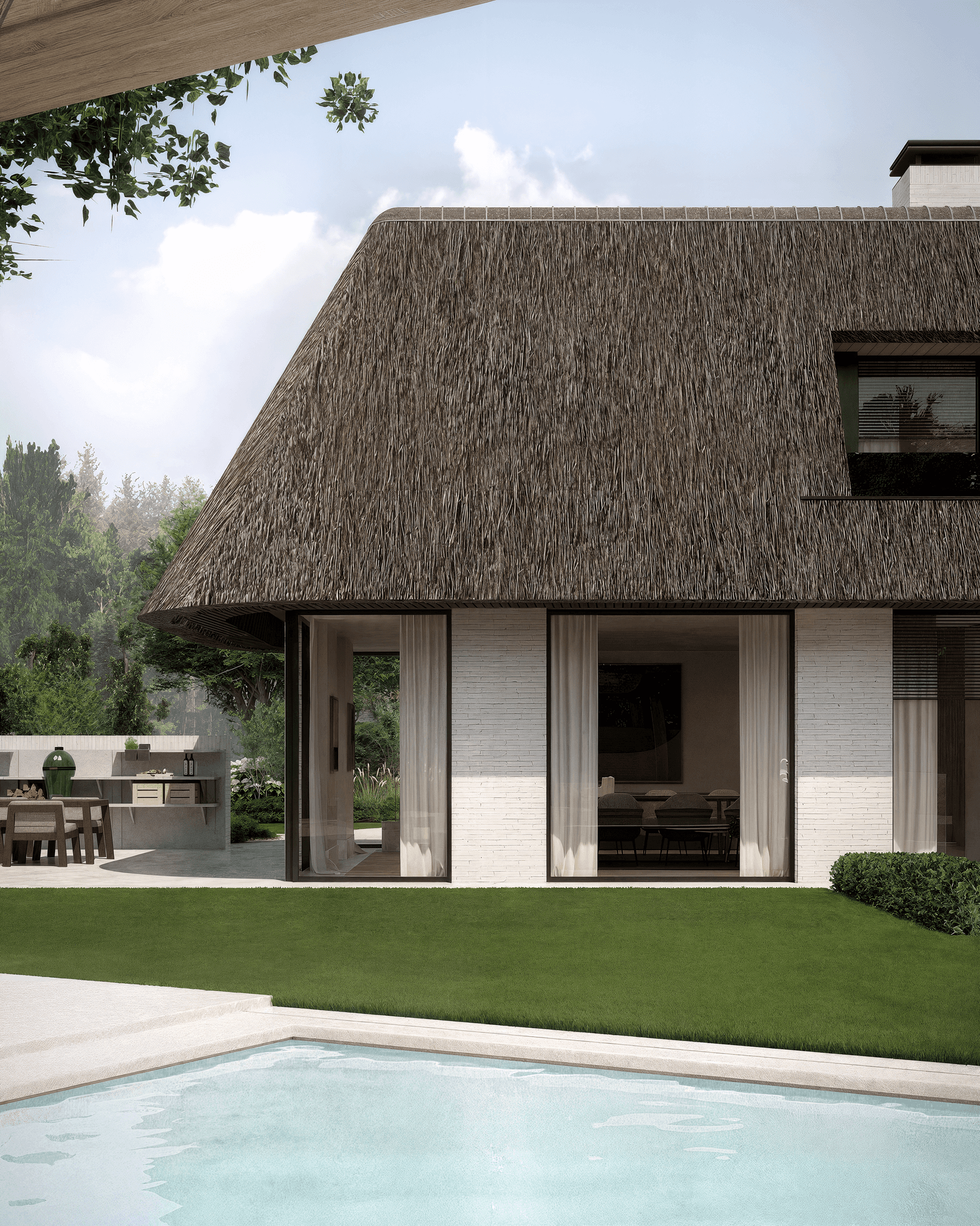 De villa is rietgedekt en uitgevoerd in gekeimde witte baksteen, wat zorgt voor een ingetogen, tijdloze uitstraling die aansluit bij de natuurlijke context.