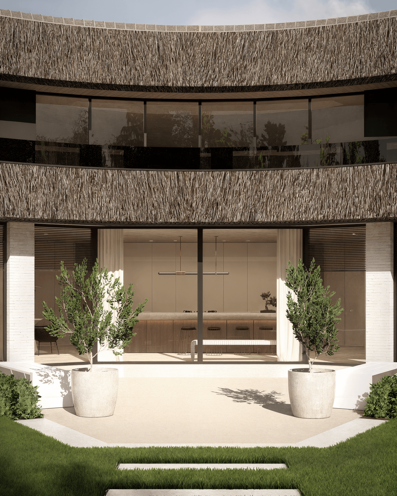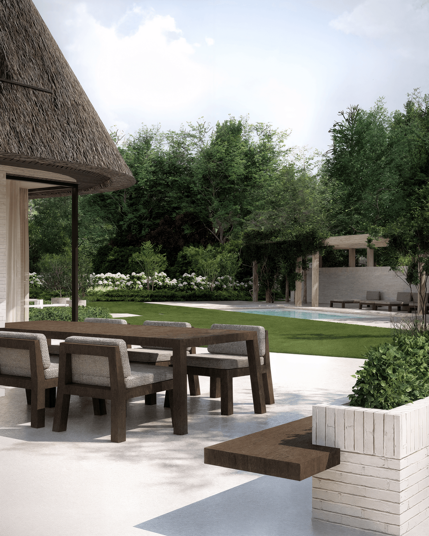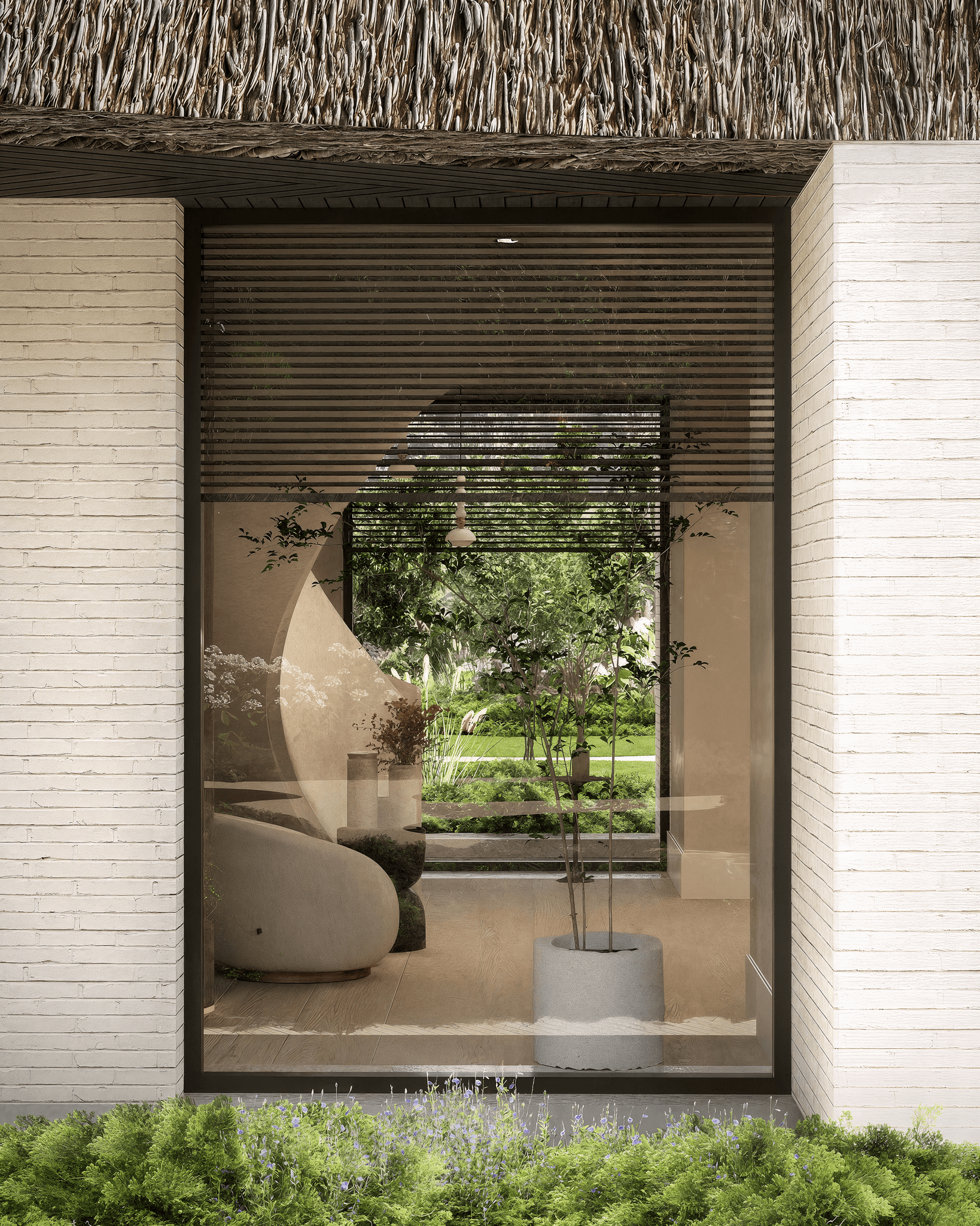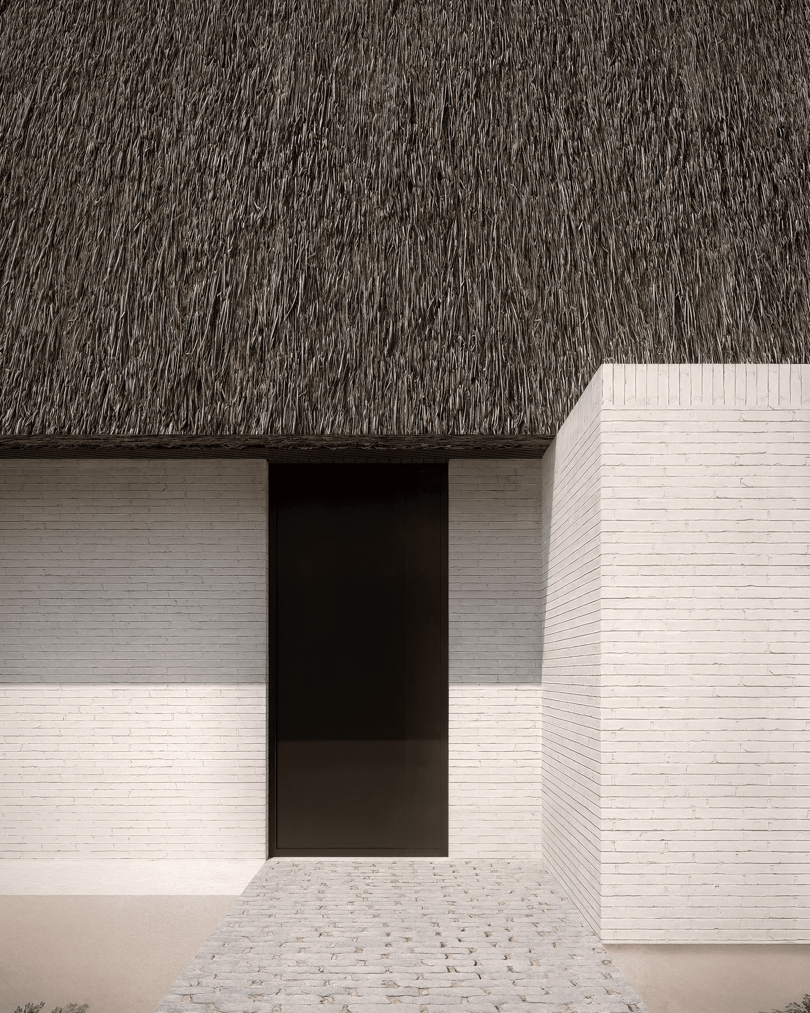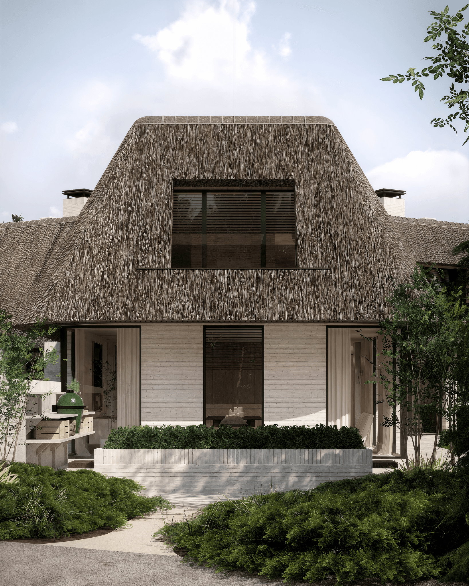 De villa is rietgedekt en uitgevoerd in gekeimde witte baksteen, wat zorgt voor een ingetogen, tijdloze uitstraling die aansluit bij de natuurlijke context.