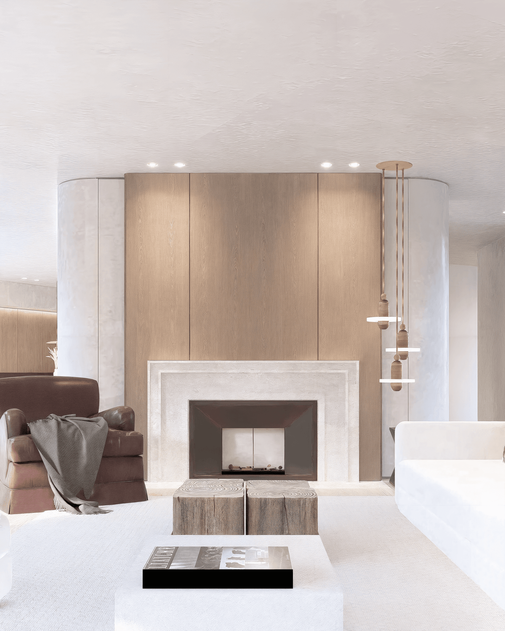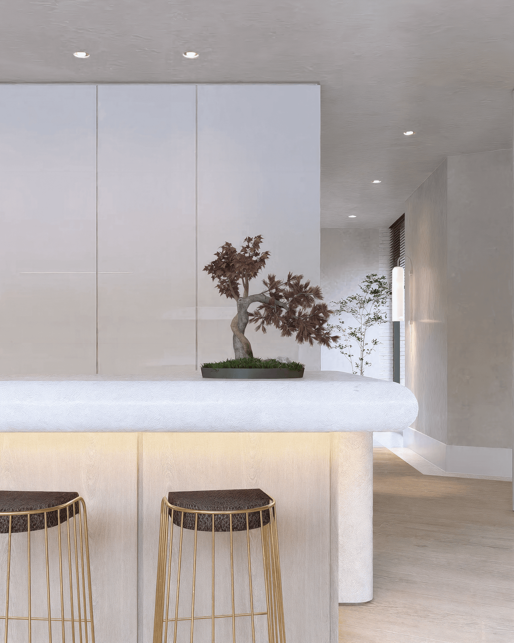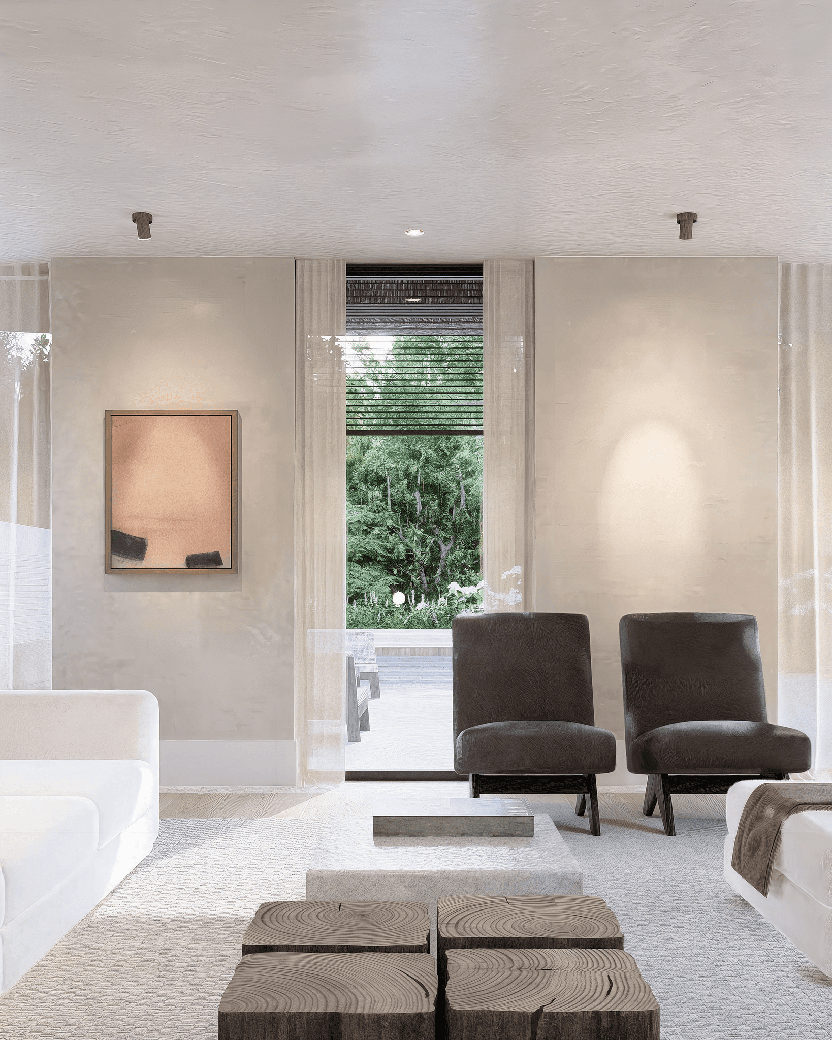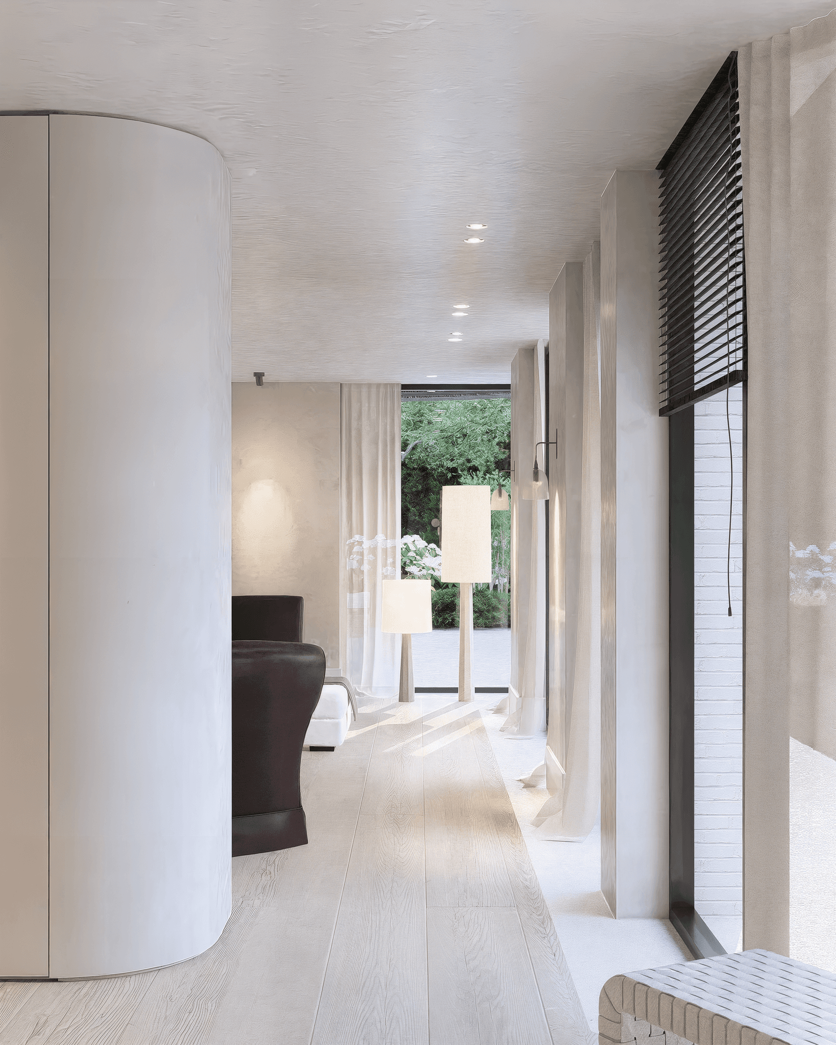 De villa is rietgedekt en uitgevoerd in gekeimde witte baksteen, wat zorgt voor een ingetogen, tijdloze uitstraling die aansluit bij de natuurlijke context.